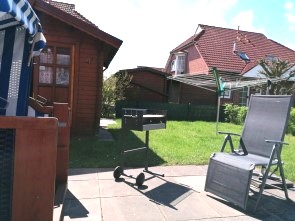 Den Feriengästen steht der mit einem Jägerzaun komplett eingezäunte Garten mit Liegewiese, Strandkorb und Terrasse mit ausreichend Gartenmöbel mit Auflagen zur Verfügung.