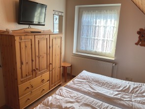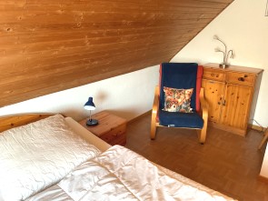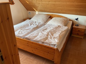 Obergeschoss: Zwei Schlafzimmer jeweils mit Doppelbetten, einmal zusätzlich mit Vollkinderbett