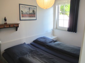 Ein Schlafzimmer mit 2 Einzelbetten die auch zum Doppelbett zusammengefügt werden können, Fenster mit Verdunkelungsvorhängen.