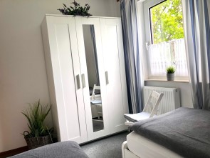 Obergeschoss: 1 Schlafzimmer mit Doppelbett, 1 Schlafzimmer mit 2 Einzelbetten. Ein Babybett kann zugestellt werden.